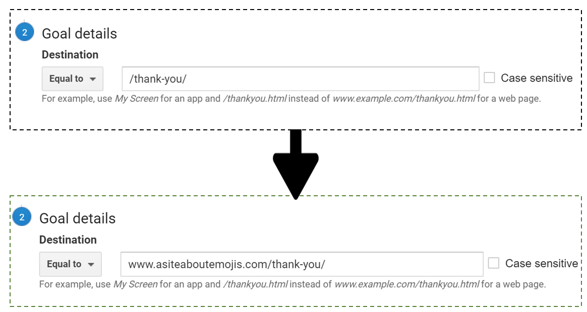 Note 2: To update your Goals so that they keep working after this change you should now update the “Destination” field so it now includes your subdomain as well.