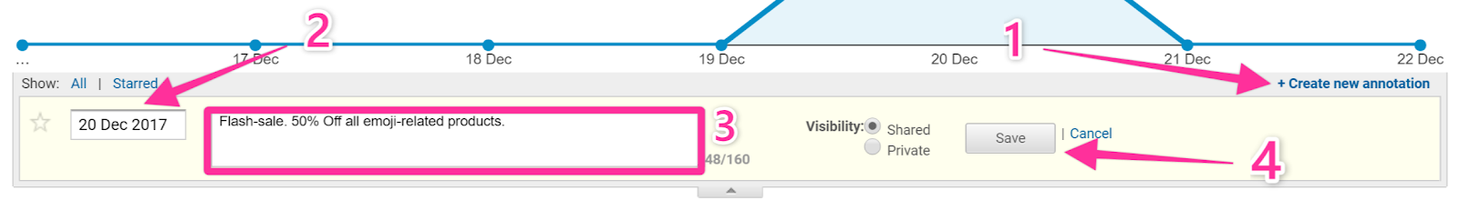 Note: If you choose to create a “Private” annotation it will only be visible to your Google Analytics account, your teammates will not be able to read it. A “Shared” annotation is available to anyone with permission to access your Google Analytics view.
