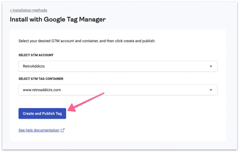 Select your GTM Account and GTM Tag Container from the dropdown, then click ‘Create and Publish Tag’ button.