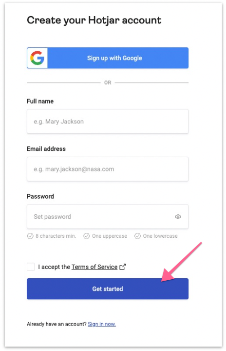 Enter your details, accept the terms of service, and click the ‘Get Started’ button. If you choose to sign up with your Google account instead, you will be taken directly to the Hotjar setup.