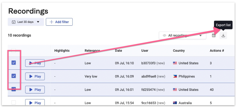 Select your recordings and click “Export.