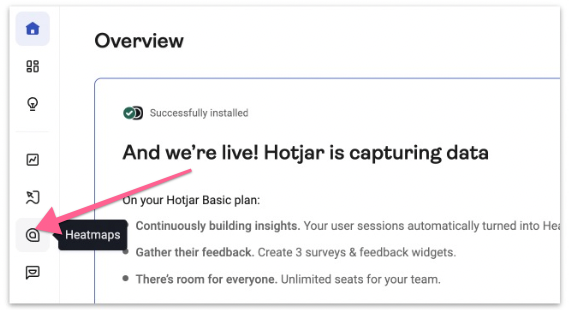 To view existing heatmaps on your site. Click the ‘Heatmaps’ icon on the sidebar.