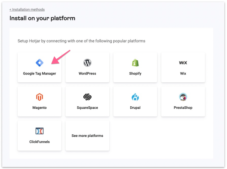In the next step, select “View platforms” and select Google Tag Manager.