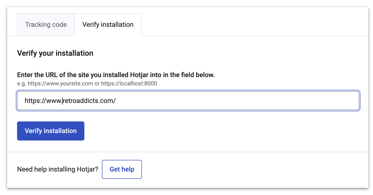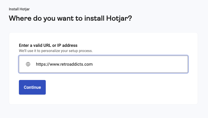 The next page will ask you ‘Where do you want to install Hotjar?’ Enter your site URL → Click the ‘Continue’ button.