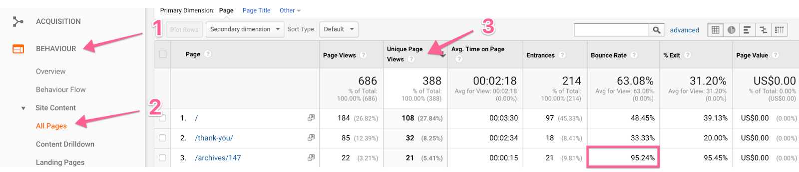 High Volume / High Bounce Rate: Open Google Analytics → On the sidebar click ‘Behavior’ → ‘Site Content’ → ‘All Pages’ → Sort by ‘Unique Page Views’ → Identify the pages where the Bounce Rate is unusually high compared to the other ones.