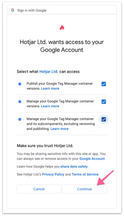 Grant Hotjar access to your Google Tag Manager account and click “Continue”.