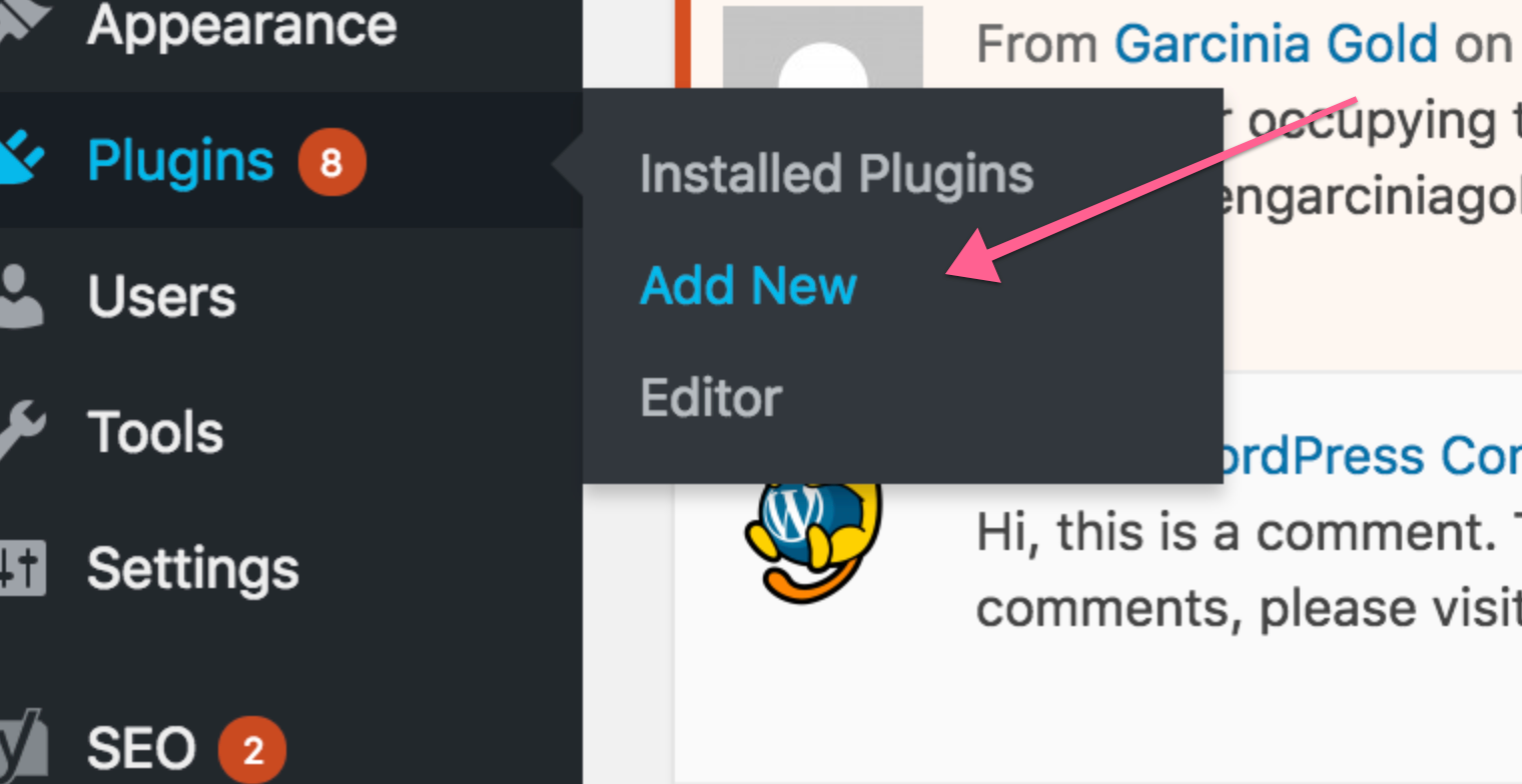 On the sidebar to the left, hover ‘Plugins’ 🡪 ‘Add New.’