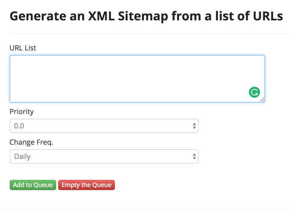 Note: Before clicking “Add to Queue” be sure to delete the list of URLs that will still be in the text input box, otherwise you’ll be adding them multiple times to your sitemap.