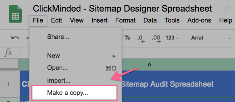 Open the Sitemap Designer Spreadsheet included with this document → Click File → Make a copy…