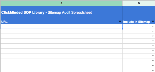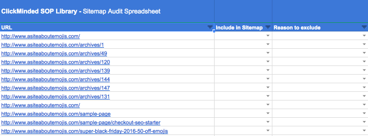 Open your sitemap spreadsheet that you’ve created on the first chapter of this document. Filter all the URLs that you have selected that you want to appear on your sitemap.