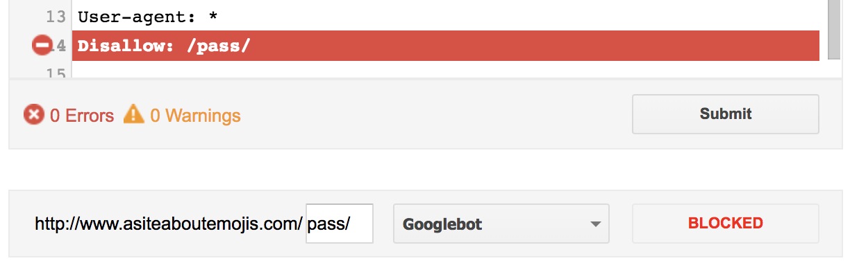Example: If you don’t want “http://asiteaboutemojis.com/passwords” to appear in the search results, blocking “/passwords” will not result on that page being removed from Google. Your results will likely remain indexed and this message will be displayed instead: