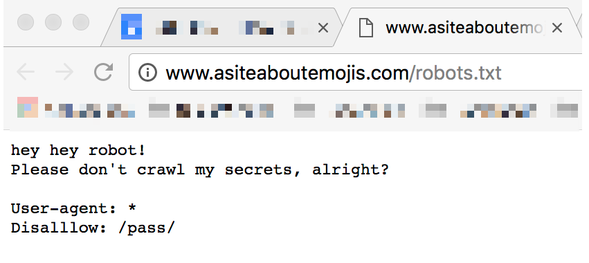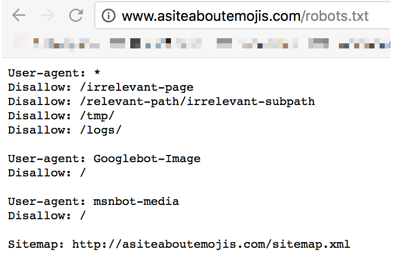 Example: “Disallow: /emojis” will disallow crawlers from accessing “asiteaboutemojis.com/emojis” but will also disallow them from accessing “asiteboutemojis.com/emojis/red”