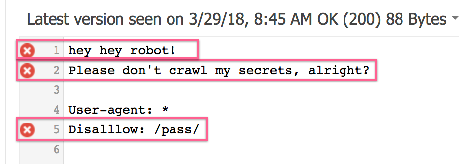 Note: If your URL is being blocked by your robots.txt you will see a “Blocked” message instead, and the tool will highlight the line that is blocking that URL: