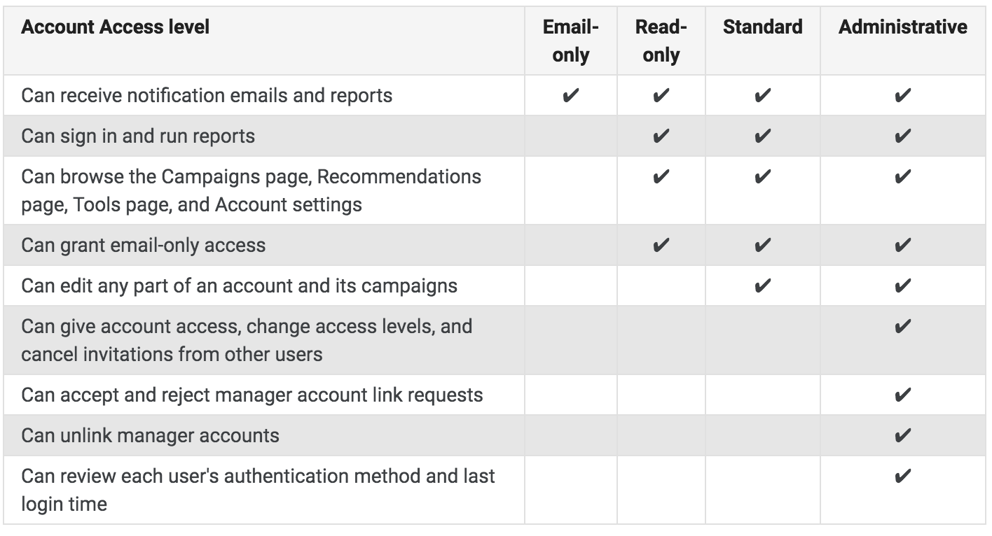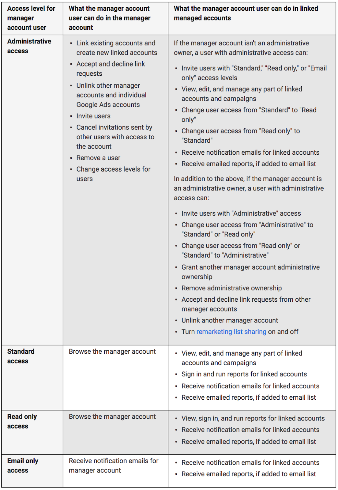 Administrative - This is the highest user-access level Google Ads has to offer. Only assign this level to people you absolutely trust.