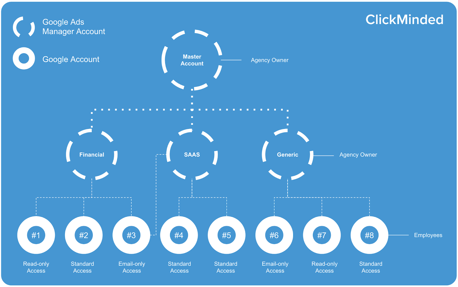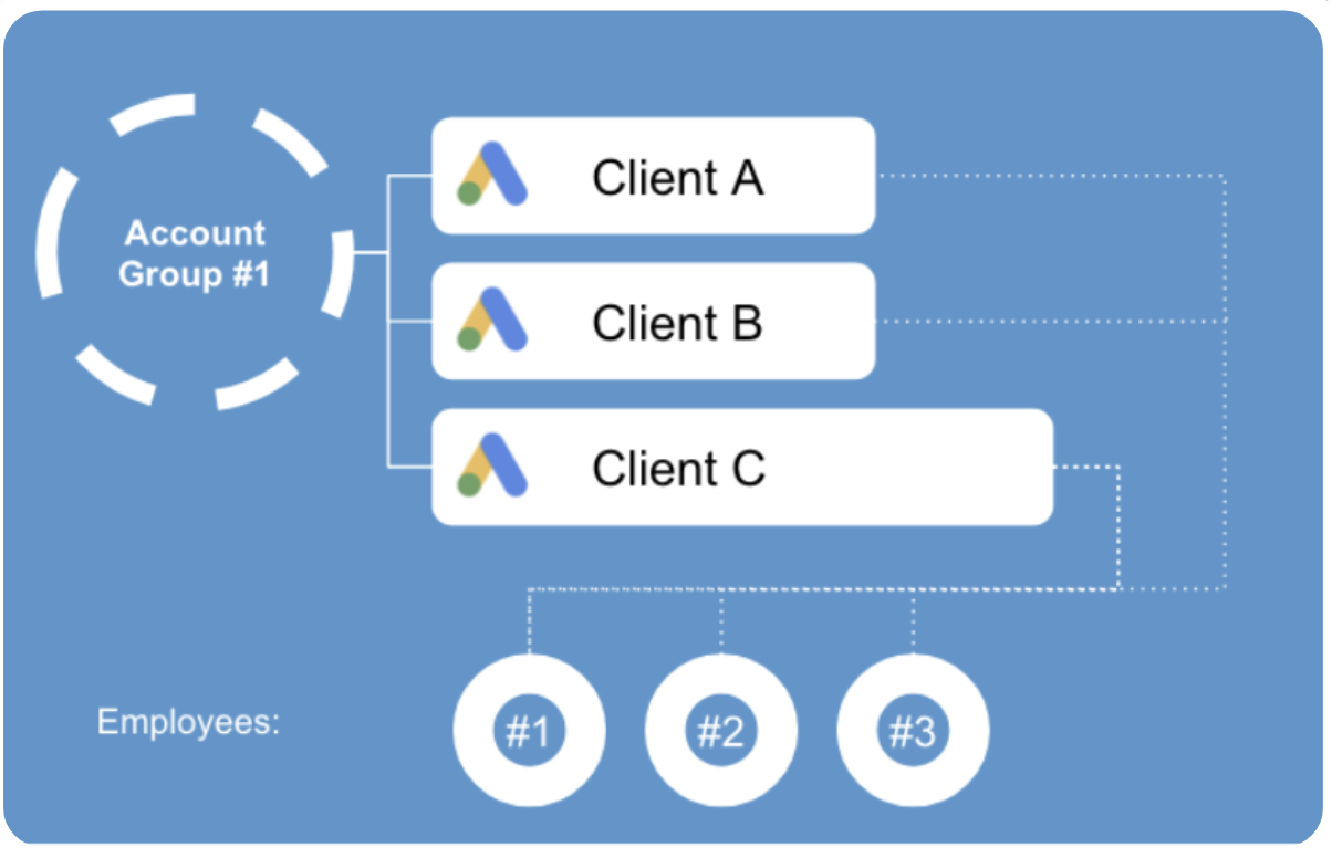 Account Group #1, #2, #3, #X - These Google Ads Manager Accounts will group the accounts that will be shared among the different team members/employees working on them.