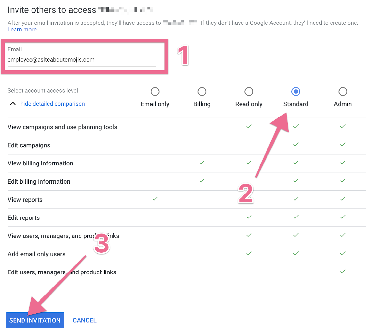Note: If you are unsure about the kind of access you should provide. Refer to the first chapter of this document, section “1) Google Ads Account access levels”.