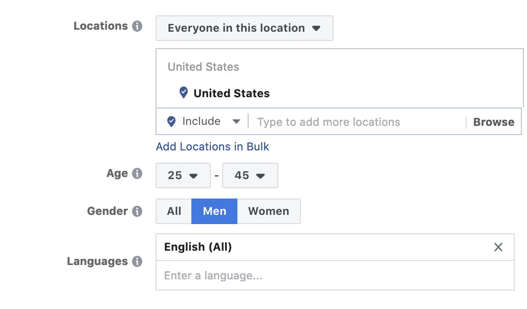 Remember: While location and language should be selected for most businesses, some demographics such as age and gender should only be selected if you have data that indicates that you should exclude that segment. When not sure, it is usually better to leave those wide enough.
