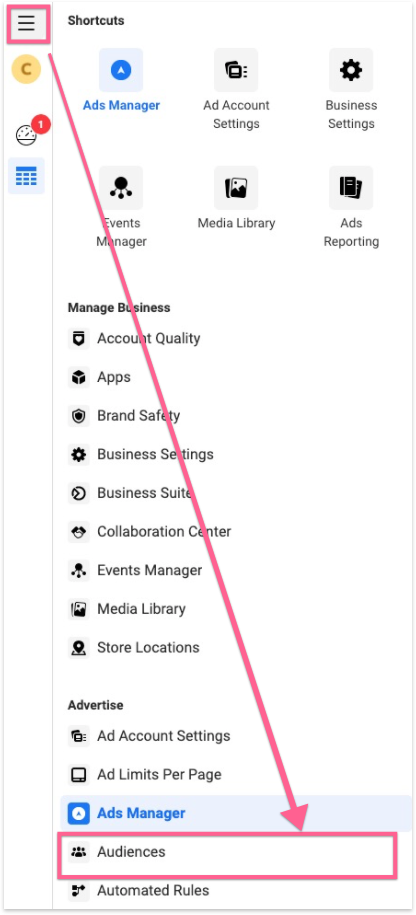 In Ads Manager, click on the all tools sidebar and click “Audiences” .