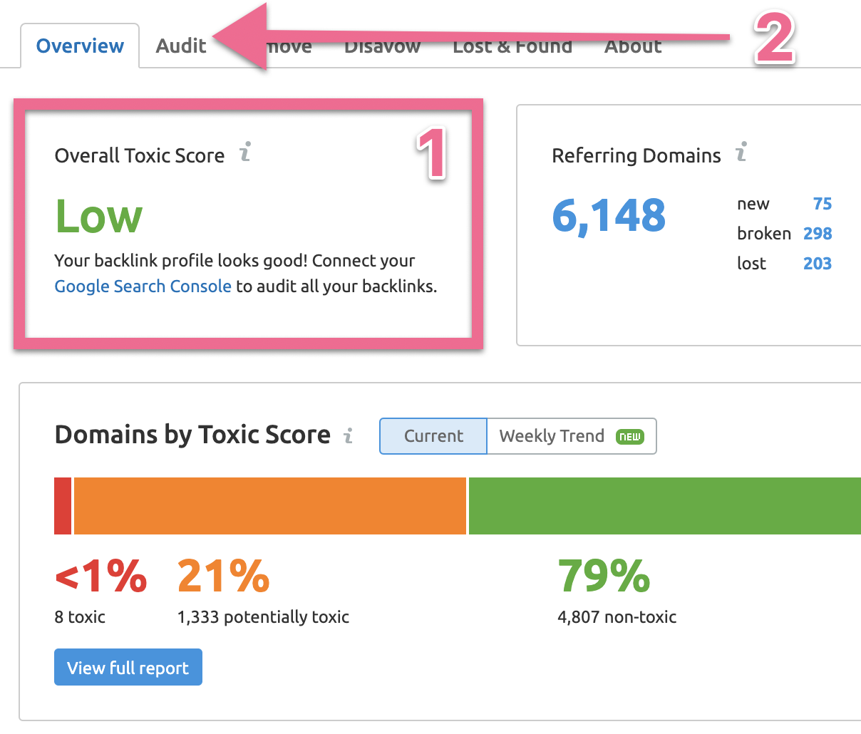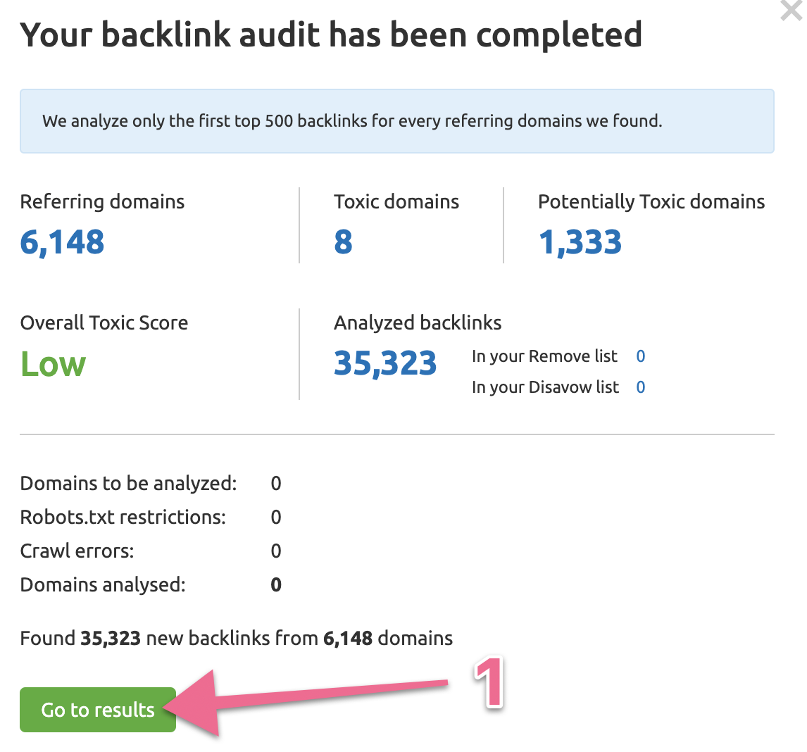 Glance over the ‘Overall Toxic Score’, this will already give you a general idea regarding how spammy the link profile is (and how much work you’ll have to do), the lower the better. → Click “Audit”.