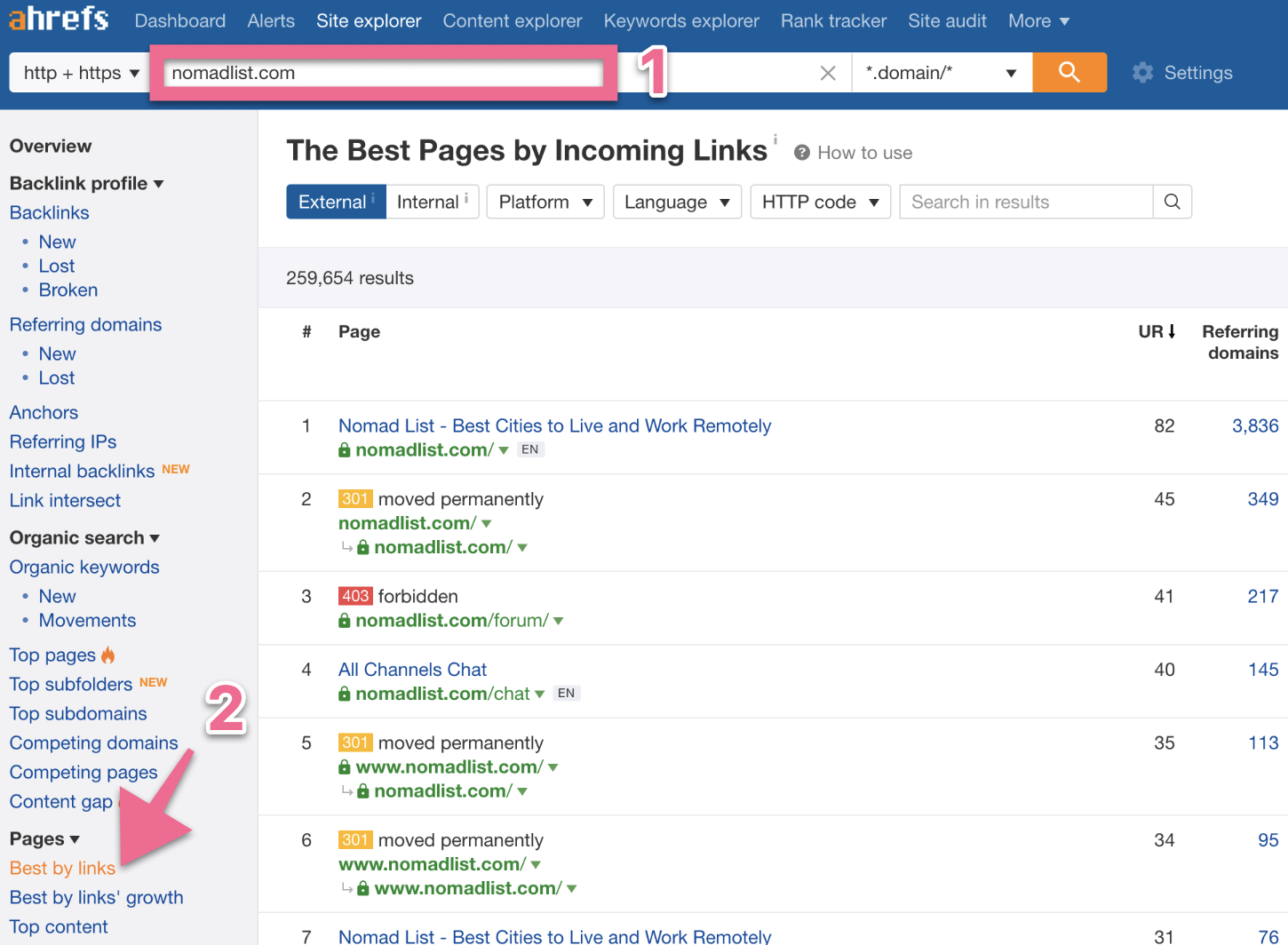 Open ahrefs, enter the site you want to analyze in the box, click the magnifying glass icon and then click “Best by links”:
