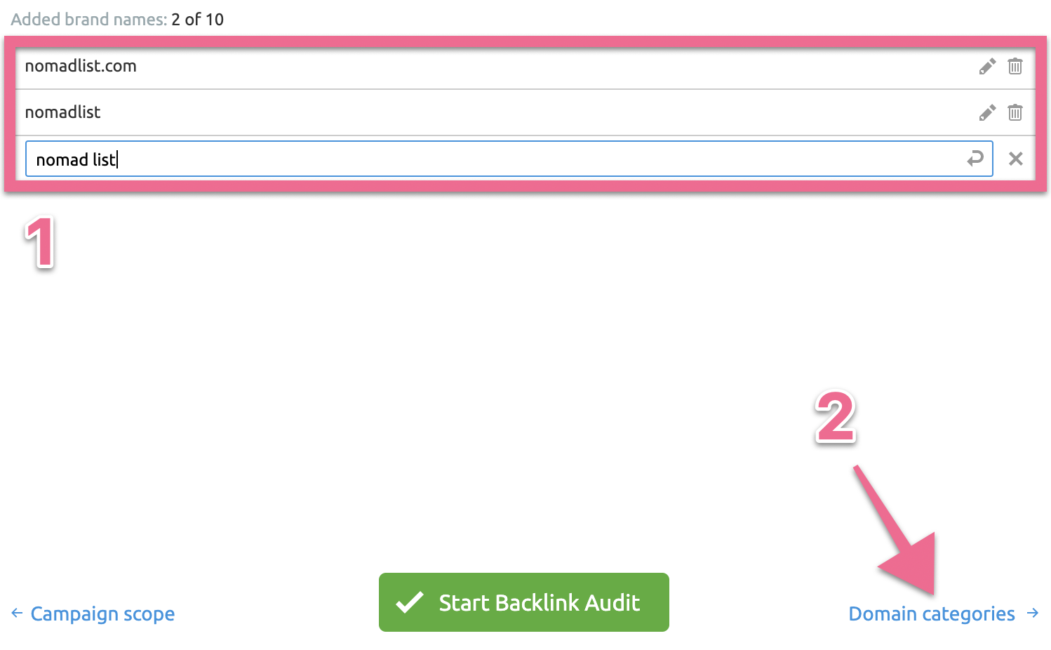 Enter all the possible ways (common variations, common acronyms) your brand could be mentioned online → Click “Domain category”