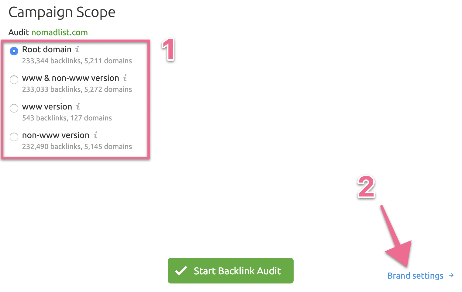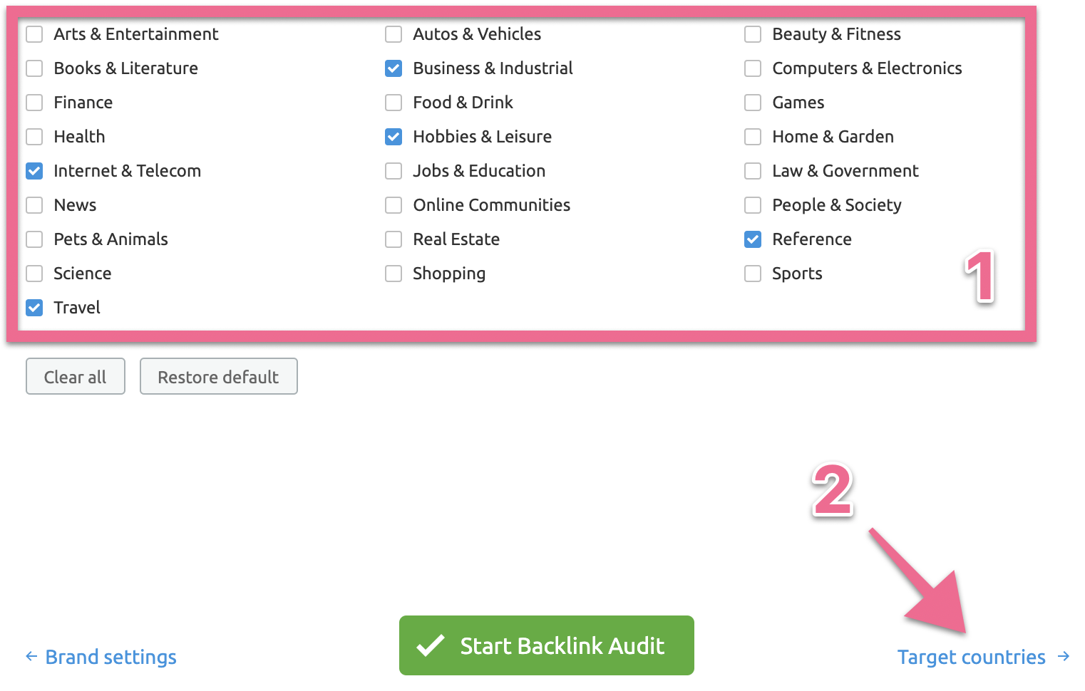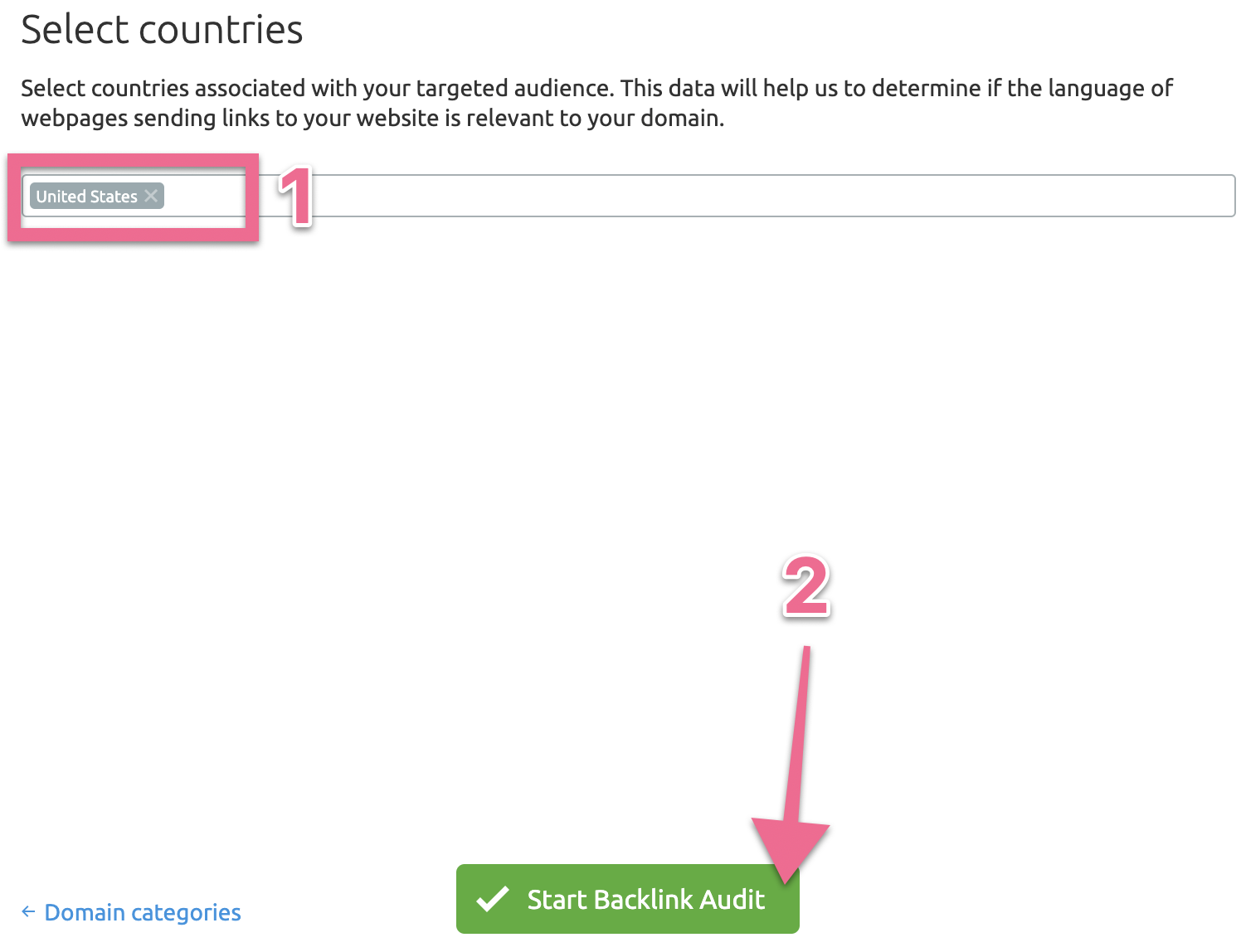 Select the target countries that fit your website → Click “Start Backlink Audit”: