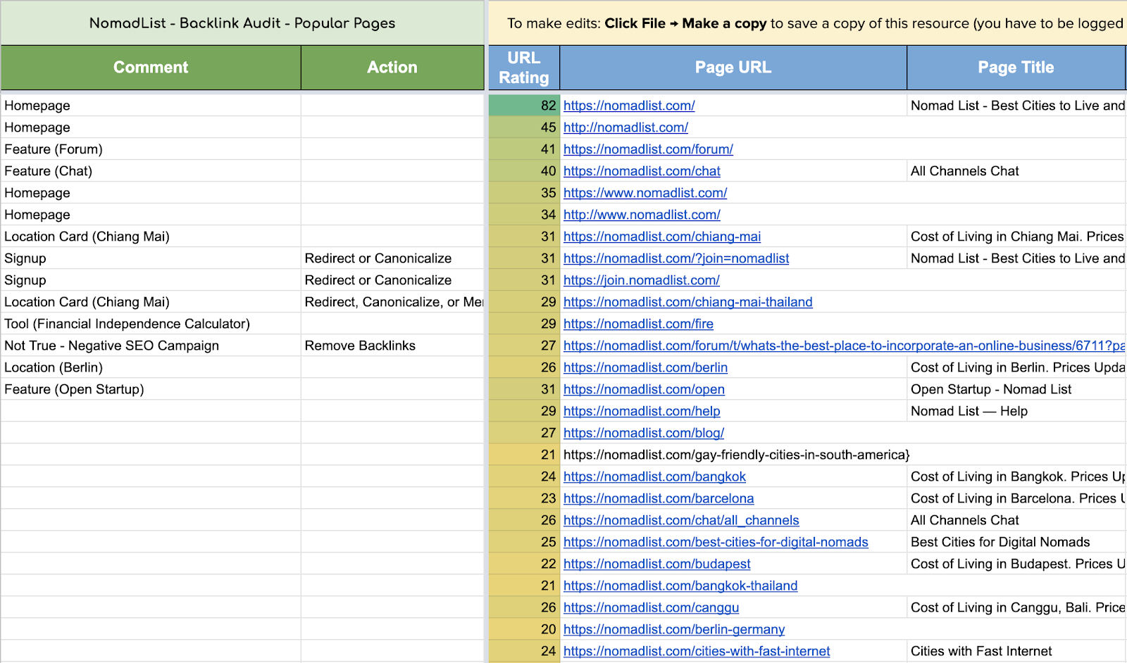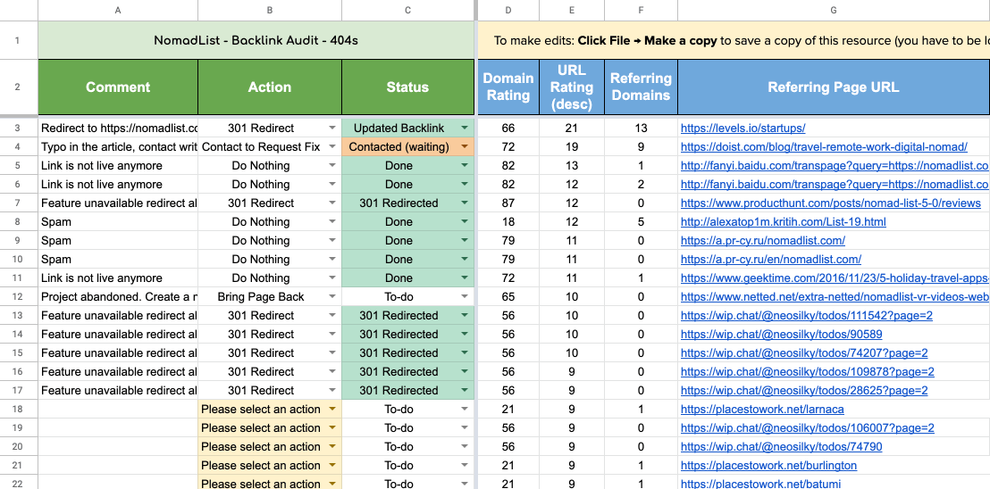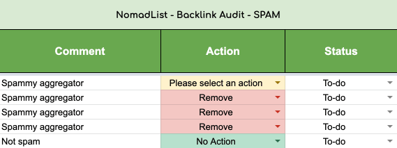 For each link, add comments and actions as needed. You might use the comment section to identify what kind of page it is to spot patterns. For example, which types of pages and content are best at generating links, or you might find some additional actions like ‘canonicalization’ that need to be performed on those pages.