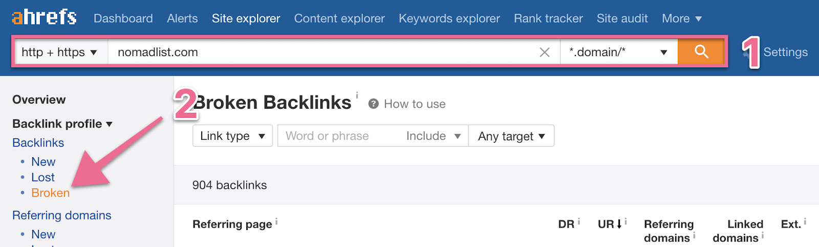 Open ahrefs, and enter the site you want to analyze in the box, click the magnifying glass icon, and then click “Broken”: