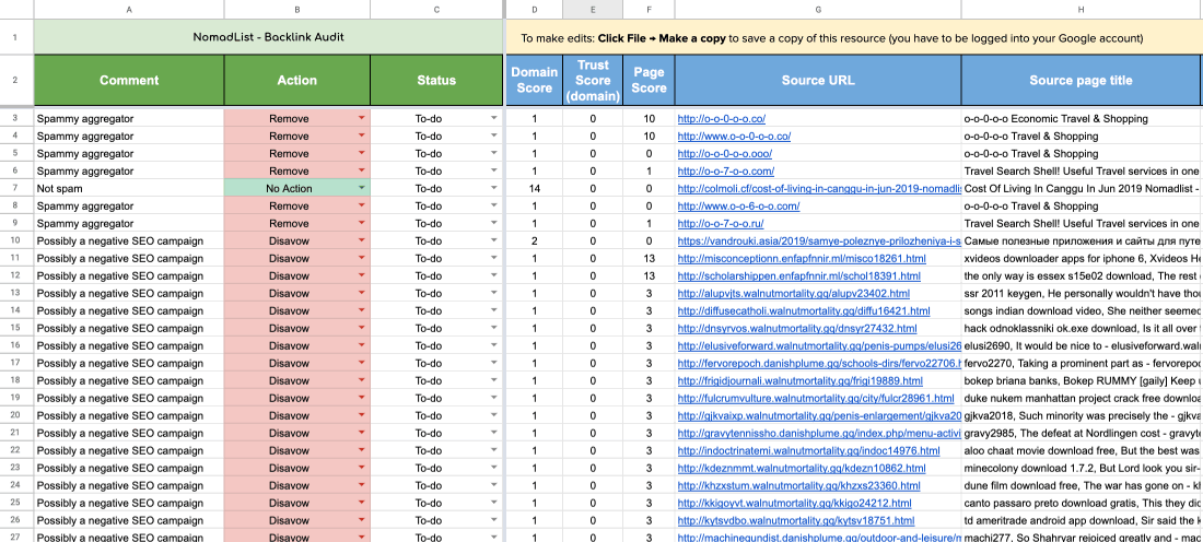 Open and make a copy of the Backlink Audit Template (Spam Audit Sheet) → Paste the values from the CSV file you opened in the previous step into the template: