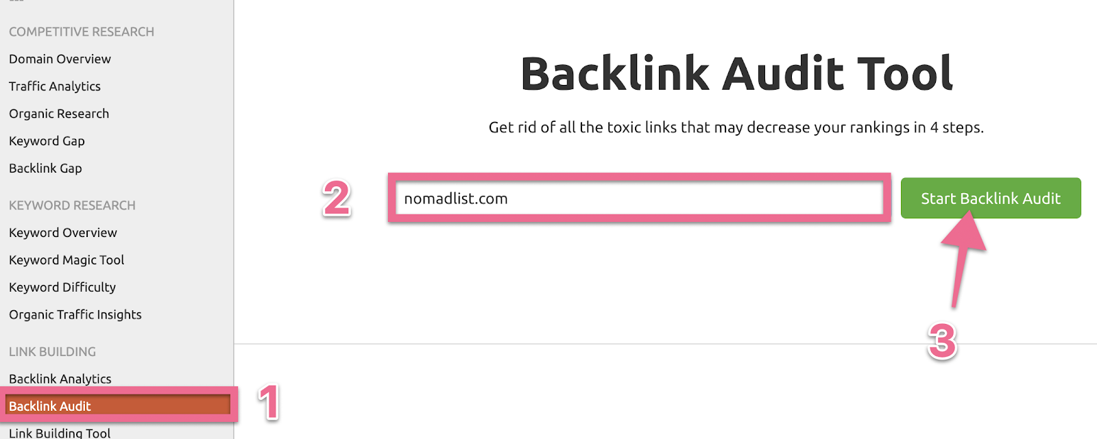 Click “Backlink Audit” on the sidebar → Enter the website that you want to audit → Click “Start Backlink Audit”: