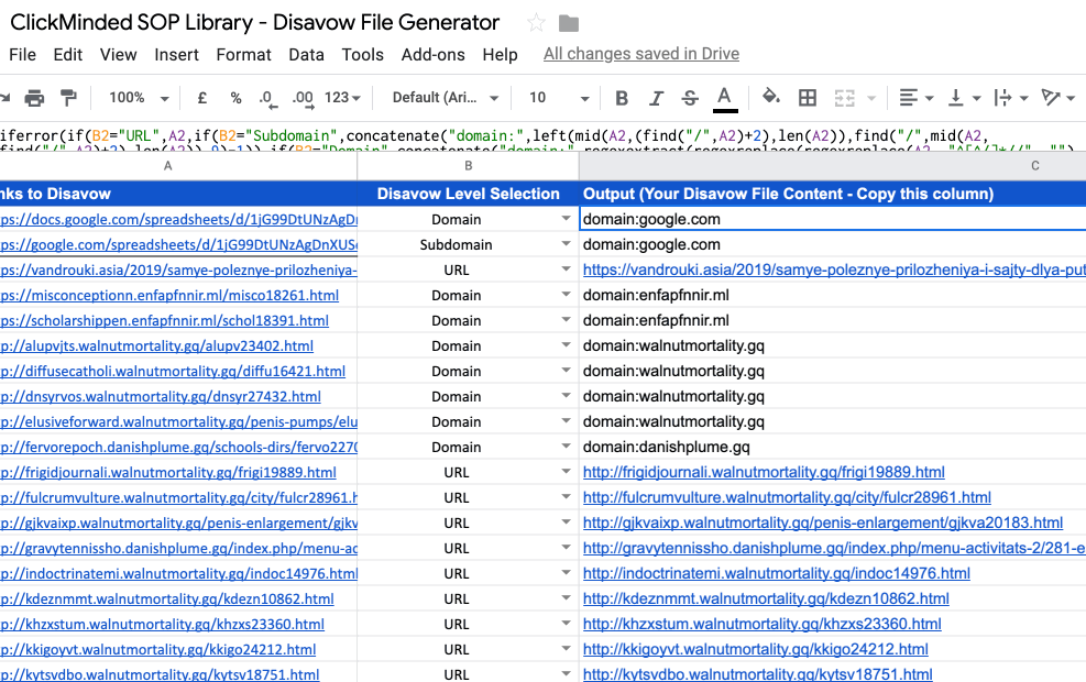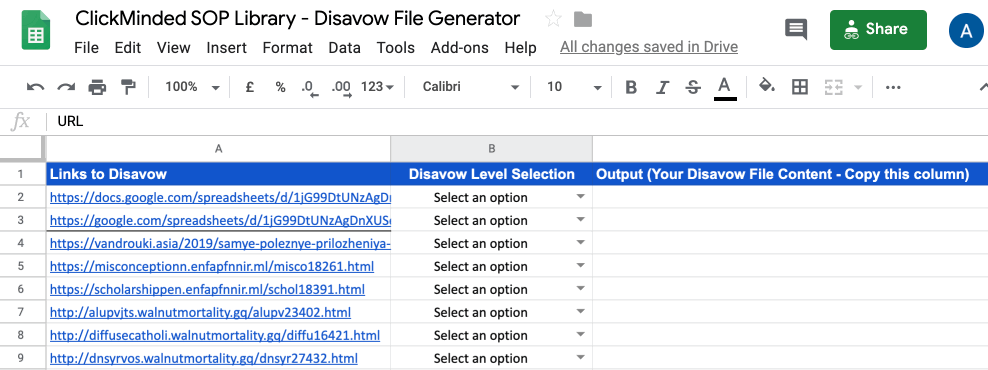 Open the Disavow File Generator, make a copy of that spreadsheet, and paste your list of links in column A: