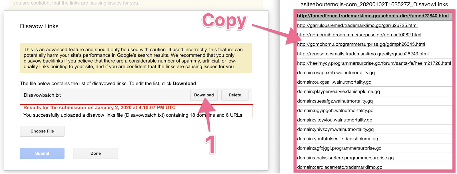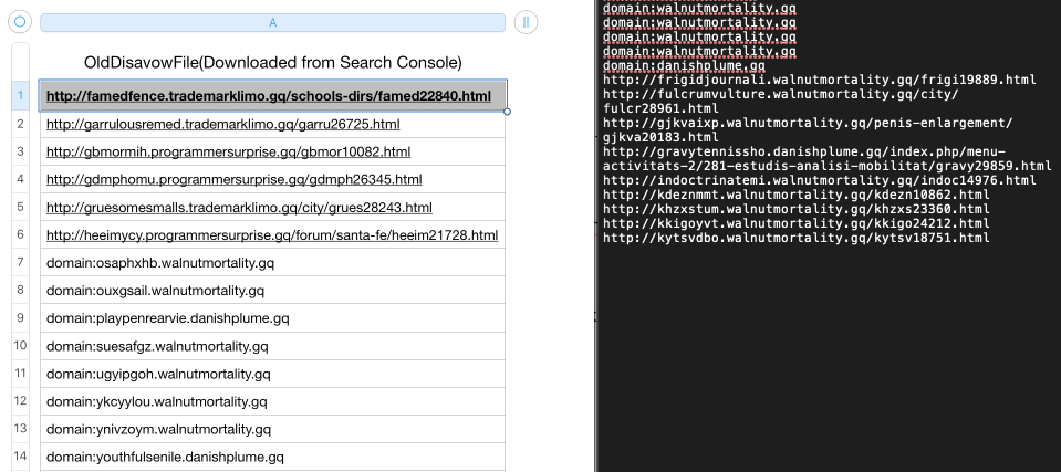 Now you will need to merge the content of the old disavow file (that you’ve just downloaded from Google Search Console), with the new file (that you have just generated using this document in the last chapter).