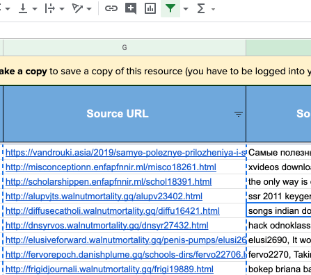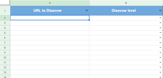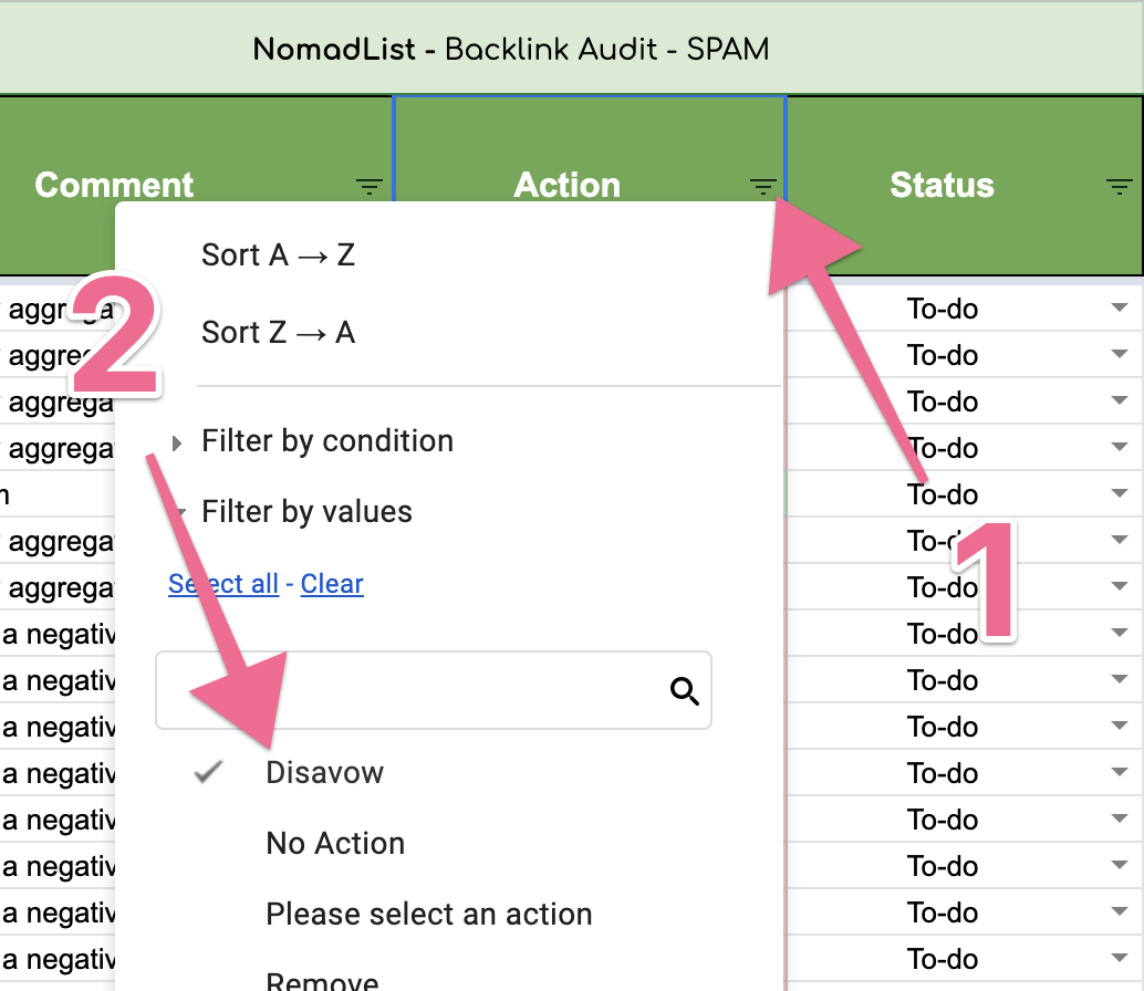 Collect the list of pages, domains, and subdomains that you will want to disavow. If you are following this document as a result of a backlink audit (recommended), and you are using Backlink Audit Template you will be able to filter the links that have been selected to be disavowed by filtering the ‘Action’ column: