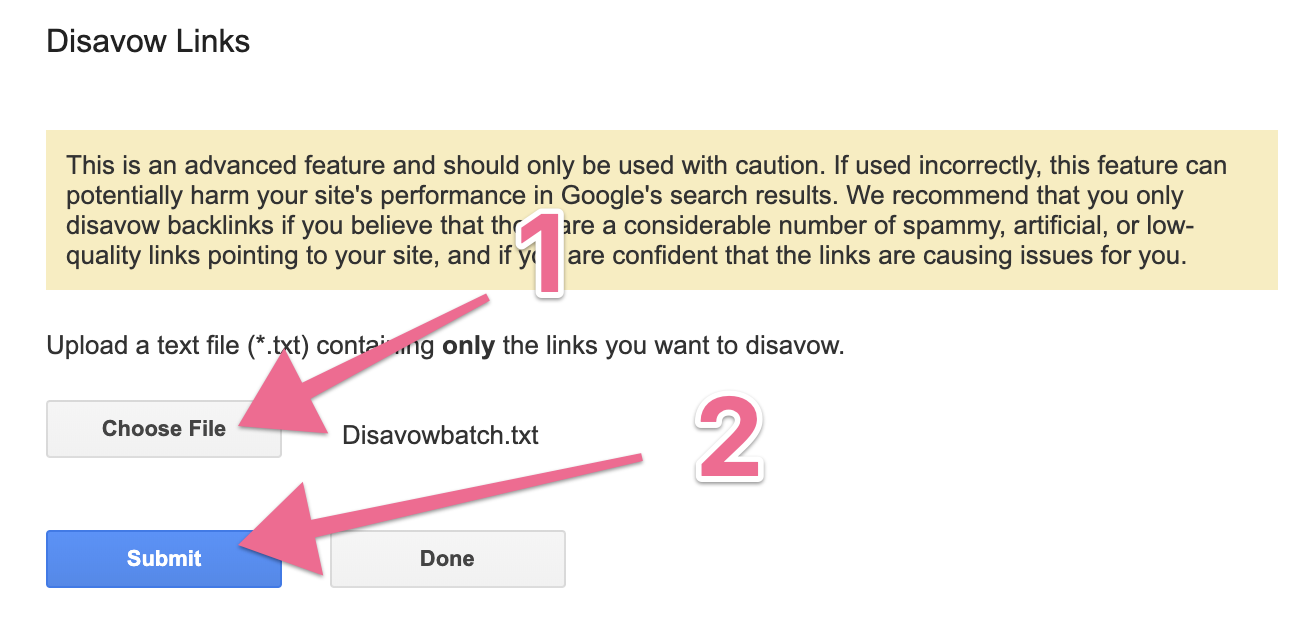 Click ‘Choose File’ and select the .txt file that contains your disavowed links, then click ‘Submit’:
