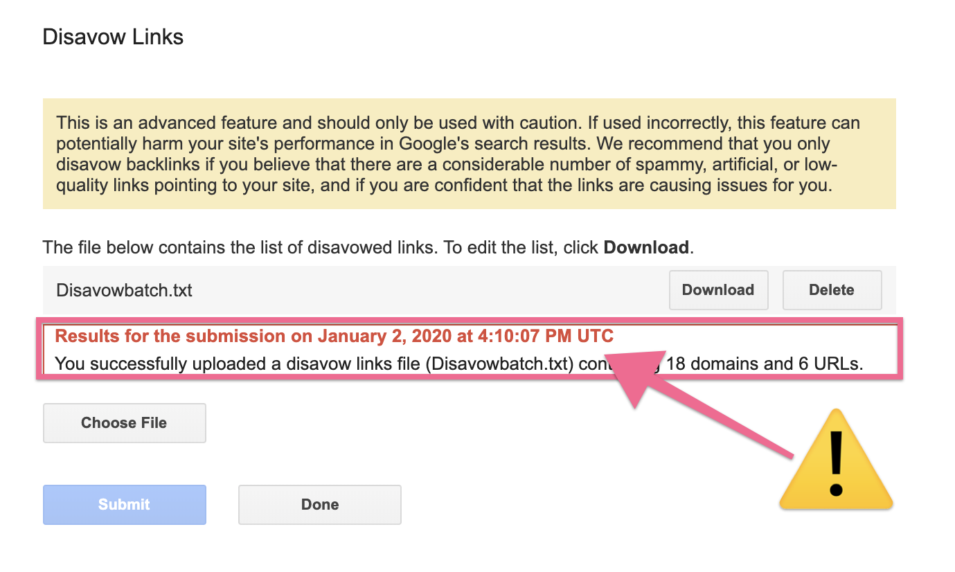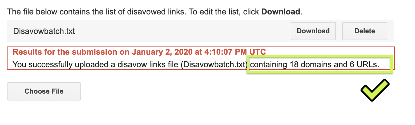 That’s it! You will get a success message letting you know how many domains and URLs have been disavowed.
