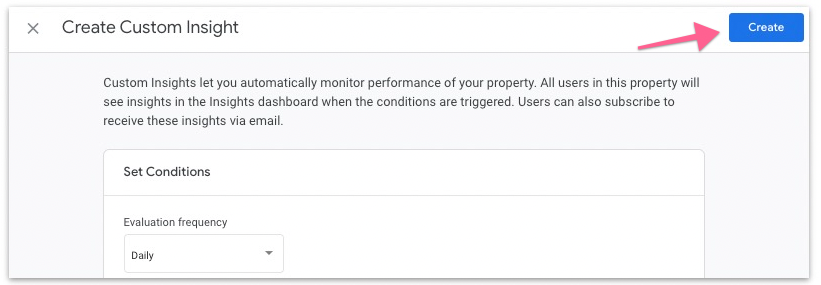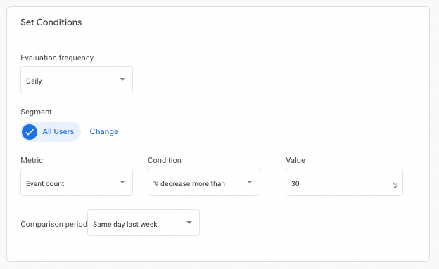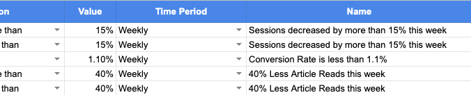 Conditions — Choose the condition where if fulfilled you’ll be notified right away. Example: When page views are 30% less than last week.