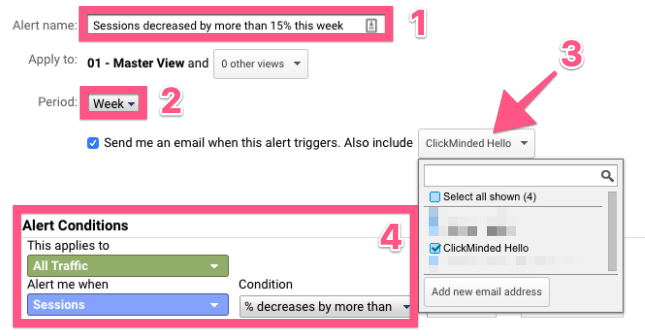Why this is important: Monitoring every single metric every day isn’t productive, and a lot of times is also not possible due to time constraints. Having Google Analytics do that for you every single day allows you to focus on what really matters.