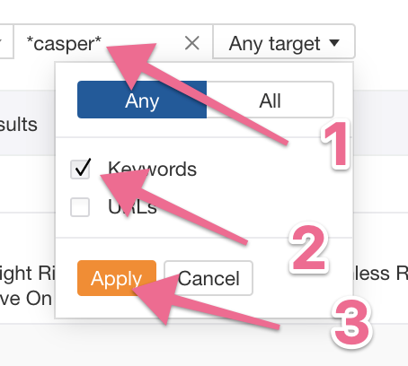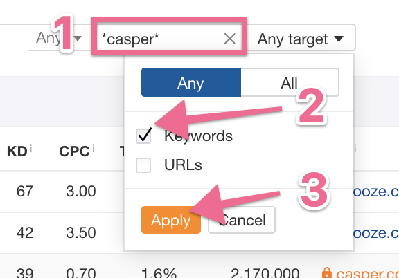 To analyze the keywords that might be relevant to your business too, you will want to remove branded keywords from the list. To do that you will enter your competitor’s name in between asterisks in the ‘Exclude’ > ‘Keyword’ filter.