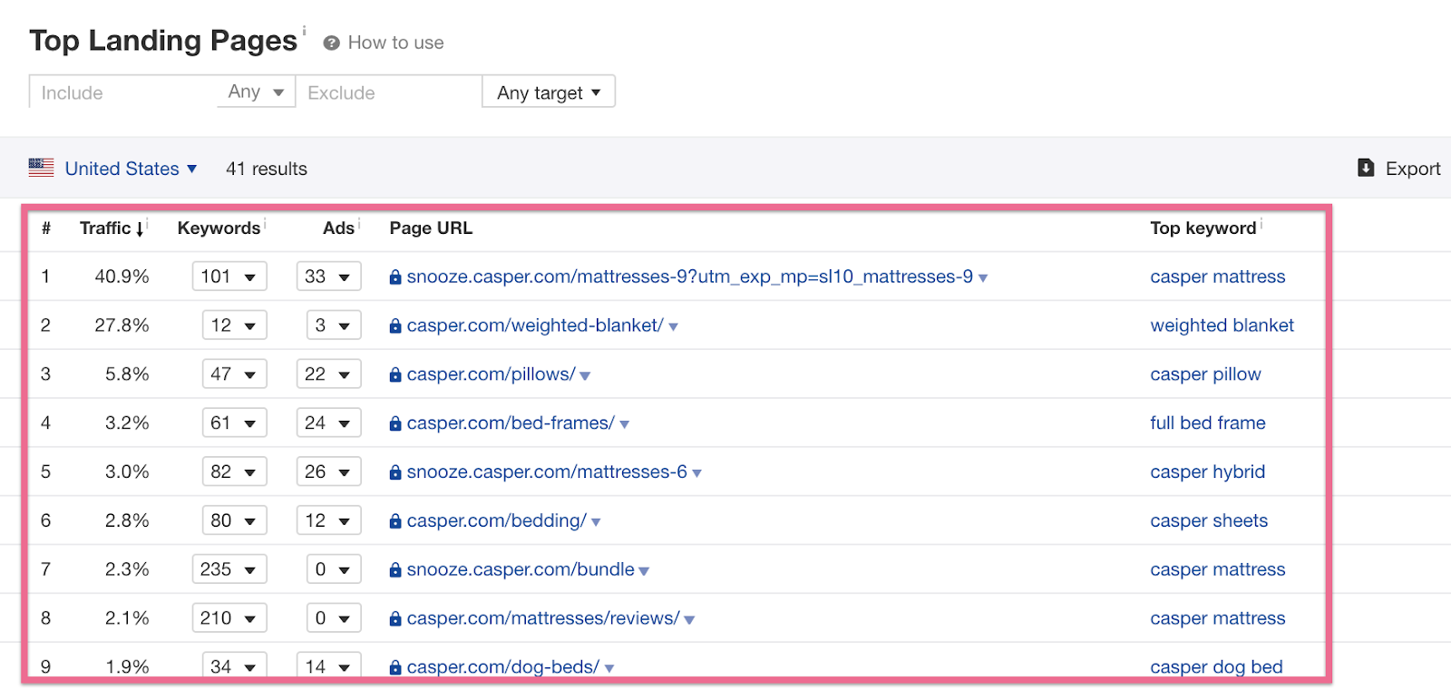 Landing Pages: Yes, relevant landing pages for different queries (https://casper.com/dog-beds/ - dog beds // https://casper.com/bed-frames/ - bed frames // etc)