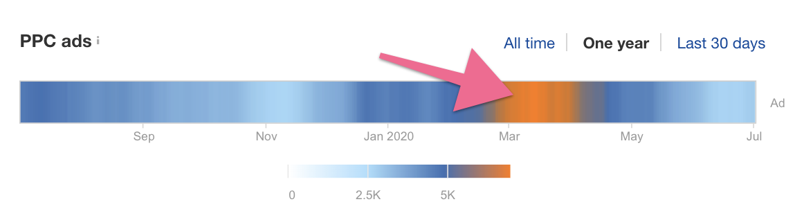 Analyze the “PPC ads” heatmap to identify the periods in which your competitor might have invested more heavily in Google Ads.