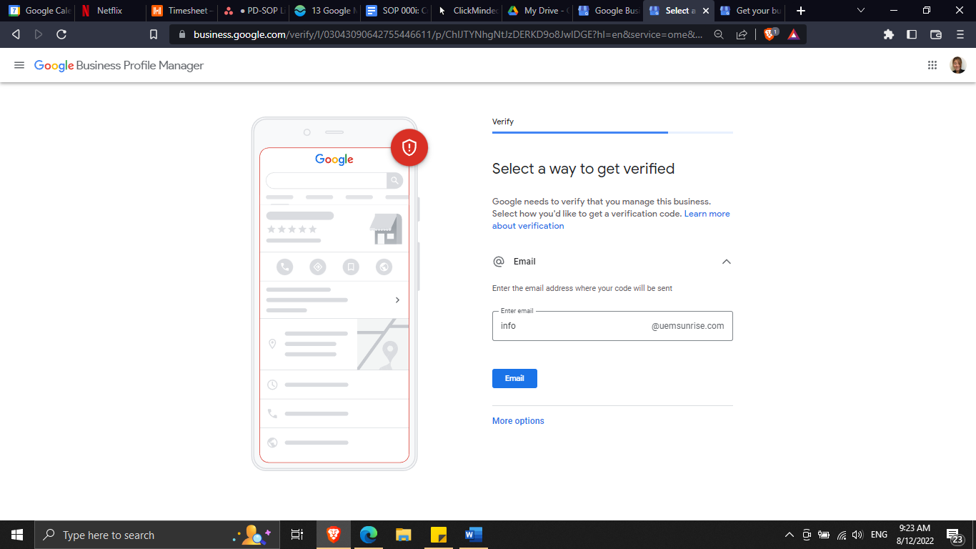 Select a method to verify your Google Business Profile