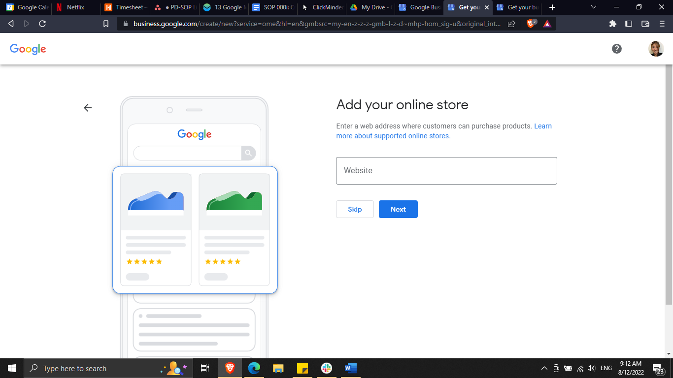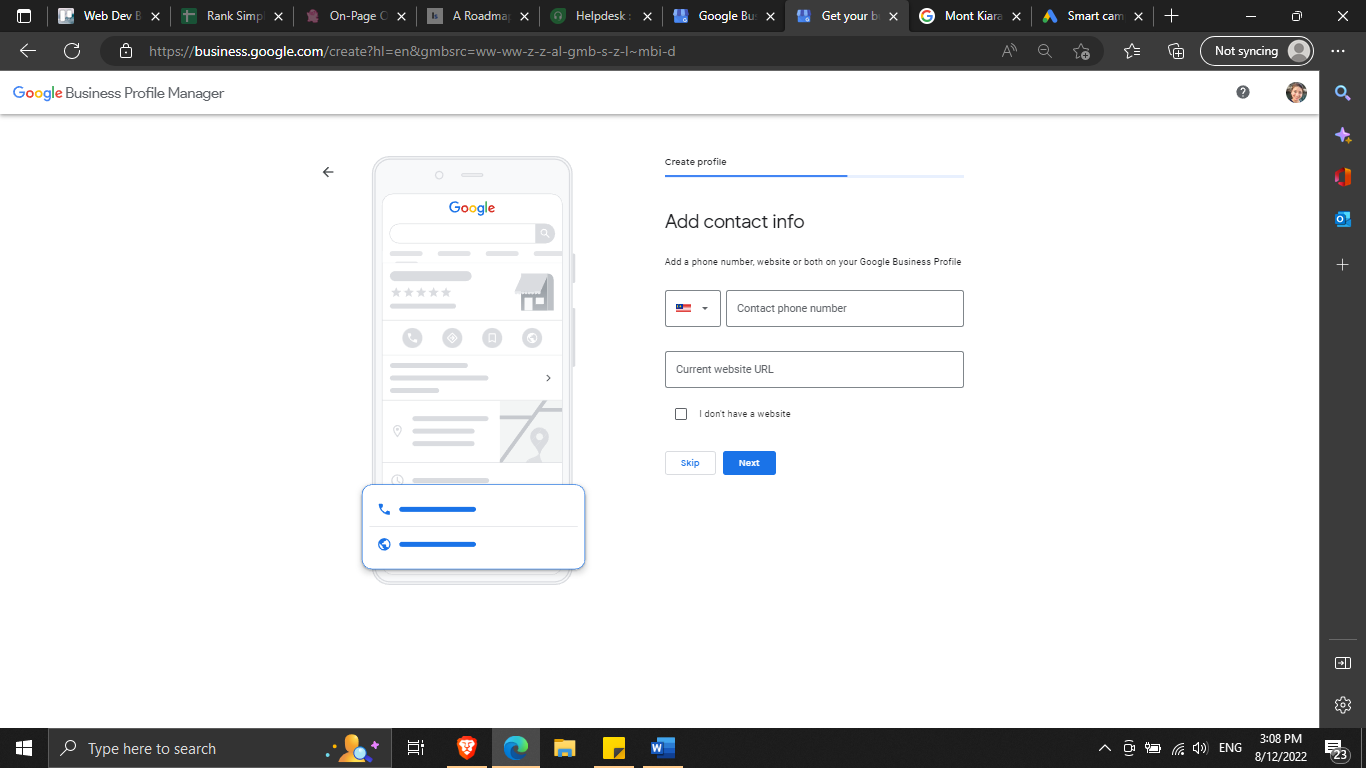 After setting up your business address or service area, you can provide your phone number and website URL to start completing your business profile (although both are optional, and you can add them later if you prefer).