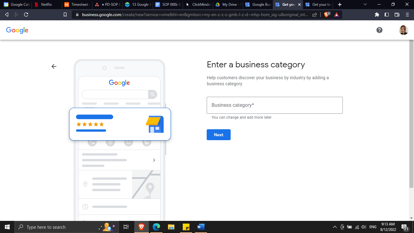 Enter your business category and click “Next”