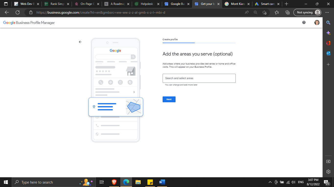 [Optional] If you also provide services or products outside of this physical location (e.g. you do deliveries or remote visits), you can add a service area in the next screen by selecting “None of these”