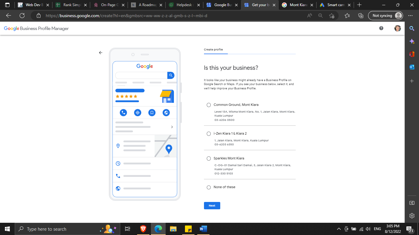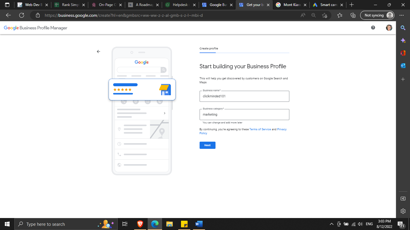 Next, type the name of the business and business category and hit “Next”