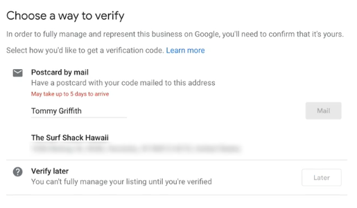 Next, Google will need to verify this business is real by mailing a postcard to the address provided containing a unique verification code. Enter the name of the person who will receive the postcard in the mail, make sure the address is correct, and click “Mail”