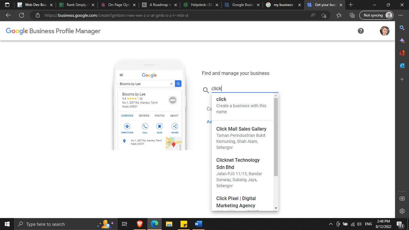 If the business you want to manage already has a Google Business Profile account (this won’t be the case for most people), you can claim it by searching for it and selecting it from the dropdown.