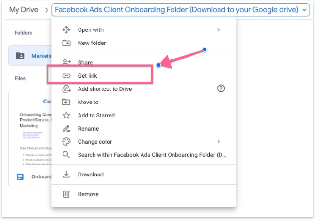 Download this Facebook Ads Client Onboarding Folder and upload it to your own Google drive folder. This folder includes an onboarding questionnaire, project management template and a subfolder “Marketing and creative resources” to onboard your client.