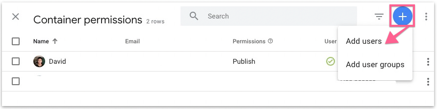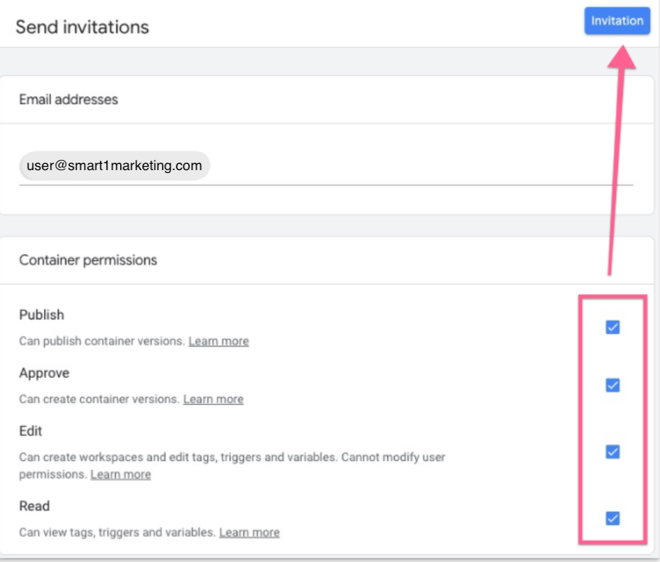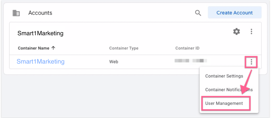 There are 2 layers of access inside Google Tag Manager: Account and Container. To select which kind of access you want to grant: