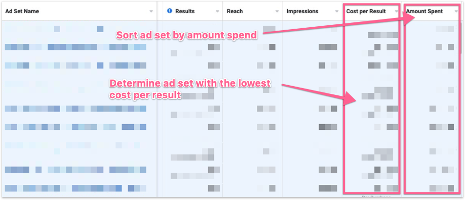 Review the current Cost per Result on Ad Sets. Which Ad Set brings you the lowest cost per conversion? Sort the Ad Sets by “Amount Spent” and determine which Ad Sets have the lowest cost per result and are making the most efficient use of the budget.